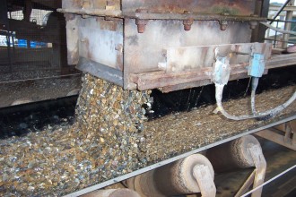 A 400mm wide MOTORISED DISCHARGE GATE (MDG-400) being used to control the load discharged of -20mm gravel (lorry loadout system). A number of these can also be used in a control system to batch and blend product, using a beltweigher at the conveyor outlet.